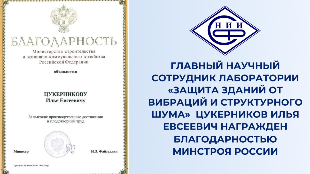 Главный научный сотрудник лаборатории «Защита зданий от вибраций и структурного шума» НИИСФ РААСН Цукерников Илья Евсеевич награжден Благодарностью Минстроя России