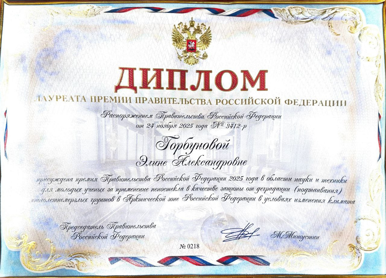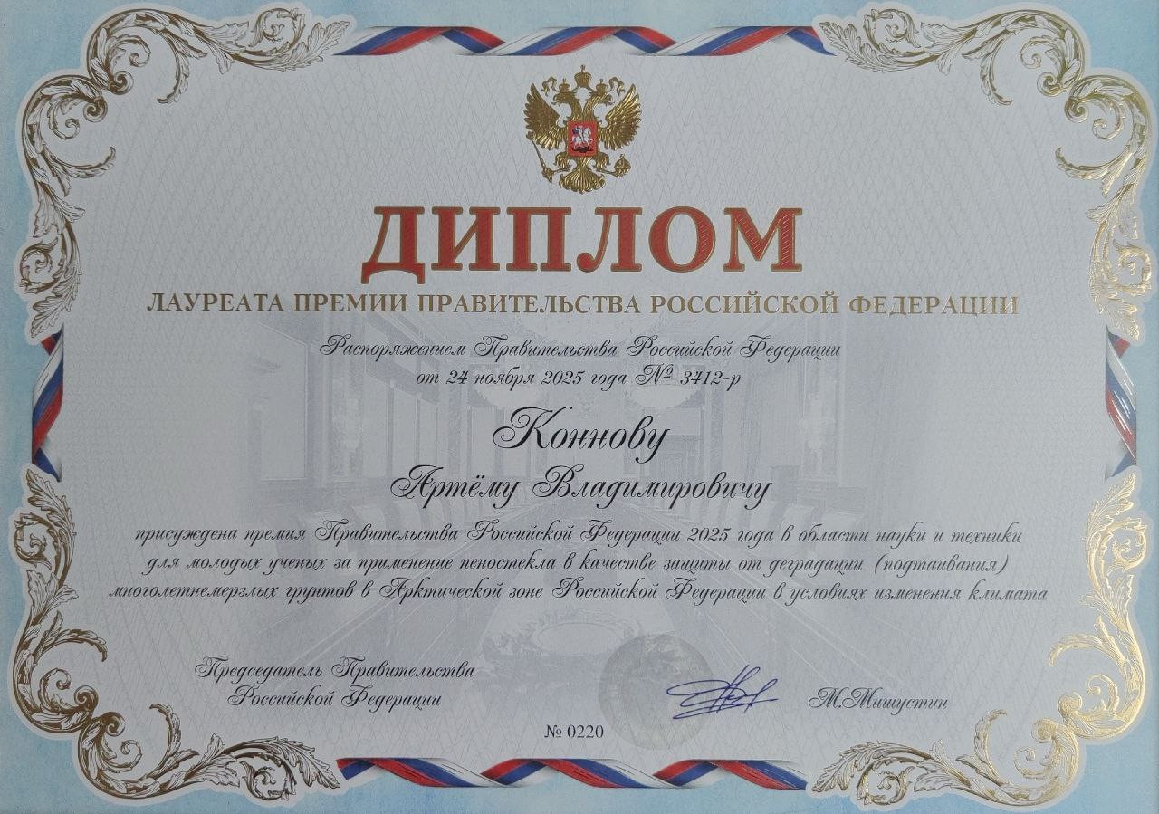 За конкурсную работу «Применение пеностекла в качестве защиты от деградации (подтаивания) многолетнемерзлых грунтов в Арктической зоне РФ в условиях изменения климата» заместитель Министра науки и высшего образования РФ Денис Секиринский вручил Дипломы и знаки Лауреатов премии Правительства Российской Федерации молодым сотрудникам НИИСФ РААСН: ведущему инженеру Говрякову Илье, ведущему инженеру Горбуновой Элине, технику Тайчинову Динару и старшему научному сотруднику, к.т.н. Коннову Артему.