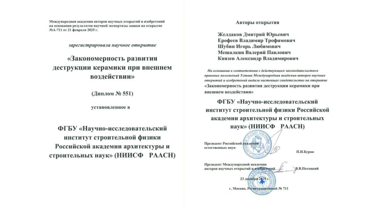 НИИСФ РААСН получил диплом № 551 от Международной академии авторов научных открытий и изобретений за научное открытие «Закономерность развития деструкции керамики при внешнем воздействии» на основании результатов научной экспертизы заявки на открытие №А-711 от 21 февраля 2025 года.