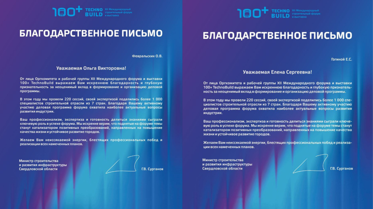 Главный научный сотрудник лаборатории «Технология очистки природных и сточных вод» НИИСФ РААСН, к.т.н. Гогина Елена Сергеевна и инженер лаборатории Февральских Ольга Викторовна получили Благодарственные письма Министра строительства и развития инфраструктуры Свердловской области за неоценимый вклад в формирование и организацию деловой программы XII Международного форума и выставки 100+ TechnoBuild 2025.