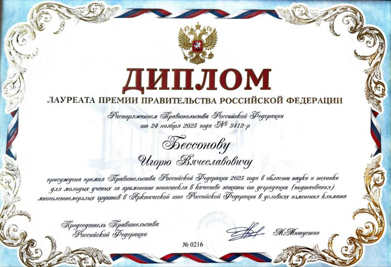 Коллективу ученых НИИСФ РААСН вручили премию Правительства Российской Федерации 2025 года в области науки и техники для молодых ученых с присвоением почетного звания лауреата премии Правительства Российской Федерации в области науки и техники для молодых ученых за работу по теме «Применение пеностекла в качестве защиты от деградации (подтаивания) многолетнемерзлых грунтов в Арктической зоне РФ в условиях изменения климата».