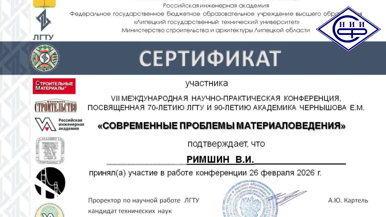 Заведующий лабораторией «Мониторинг жилищно-коммунального хозяйства и радиационная безопасность в строительстве» НИИСФ РААСН, член-корреспондент РААСН, профессор, д.т.н. Римшин В.И. принял участие в VΙI Международной научно-практической конференции, посвященной 70-летию Липецкого государственного технического университета и 90-летию академика РААСН  Чернышова Е.М «Современные проблемы материаловедения», которая прошла в городе Липецке.