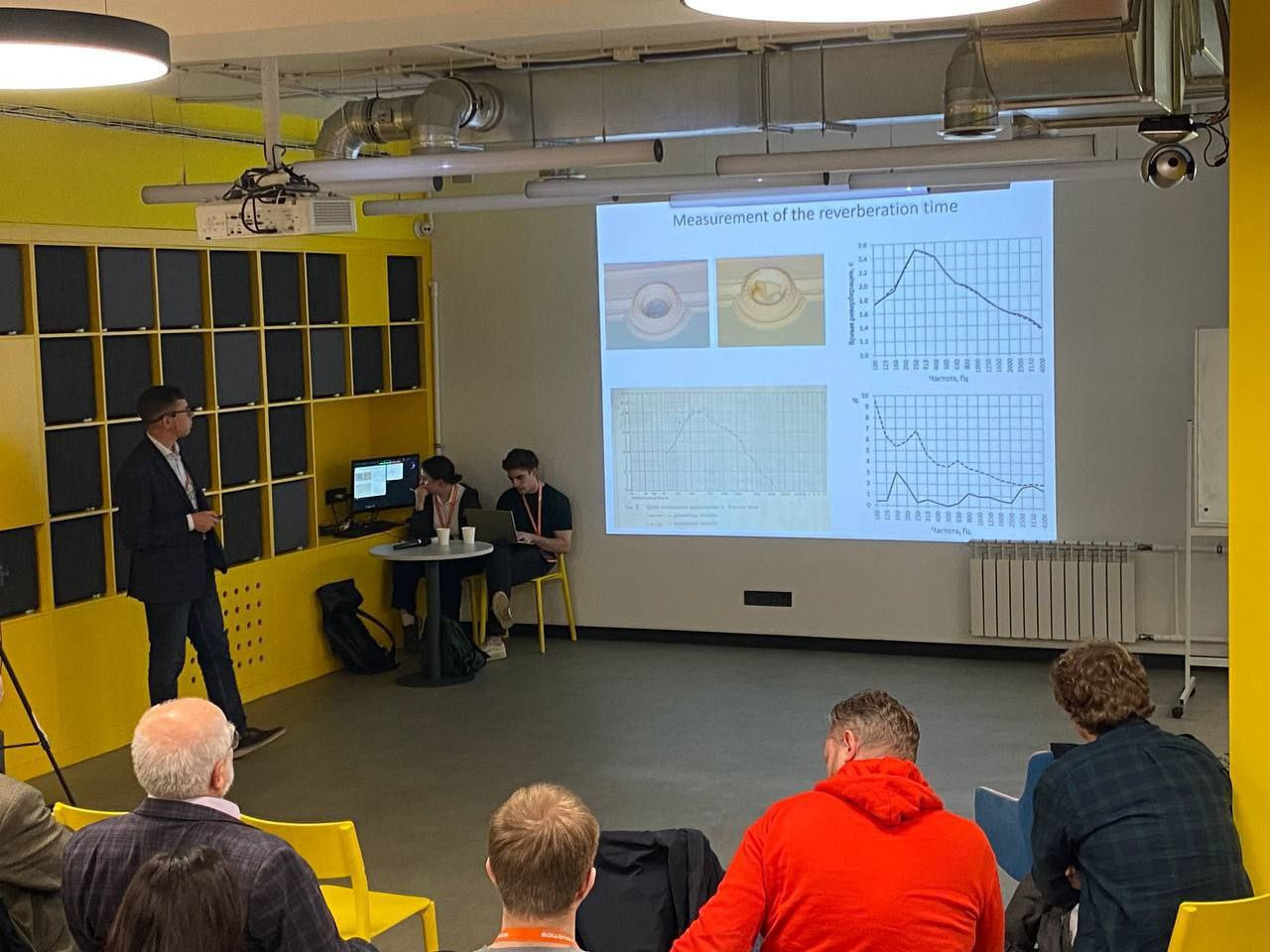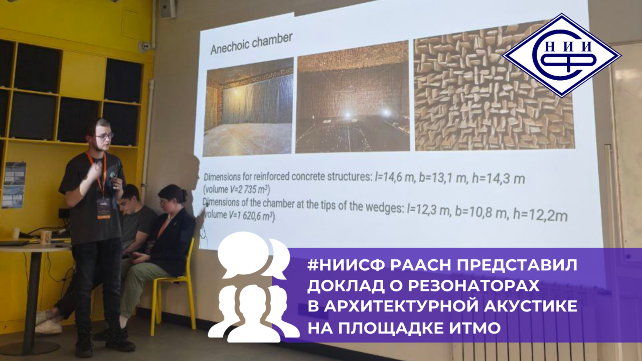 В рамках воркшопа прошла секция молодых ученых, на которой студент ИТМО Фарид Бикмухамедов рассказал о своем опыте работы в большой заглушенной камере НИИСФ РААСН и о своих исследованиях в ней.